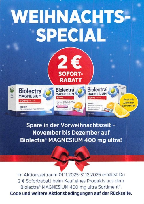 * 2€ Sofortrabatt beim Kauf eines Produkts aus dem Biolectra Magnesium 500mg ultra Sortiment.