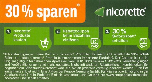 *Beim Kauf von Nicorette Produkten für mind. 25€ erhälst du 30% Sofortrabatt (ausgenommen importierte Produnke.)