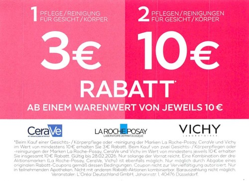 * Beim Kauf einer Gesichts-/Körperpflege oder -reinigung der Marken La Roche-Posay, CeraVe und Vichy in Wert von mind. 10€ erhalten Sie 3€ Rabatt. Beim Kauf von zwei Gesichts-/Körperpflegen oder -reinigungen der Marken La Roche-Posay, CeraVe und Vichy in Wert von mind. jeweils 10€ erhalten Sie 10€ Rabatt.